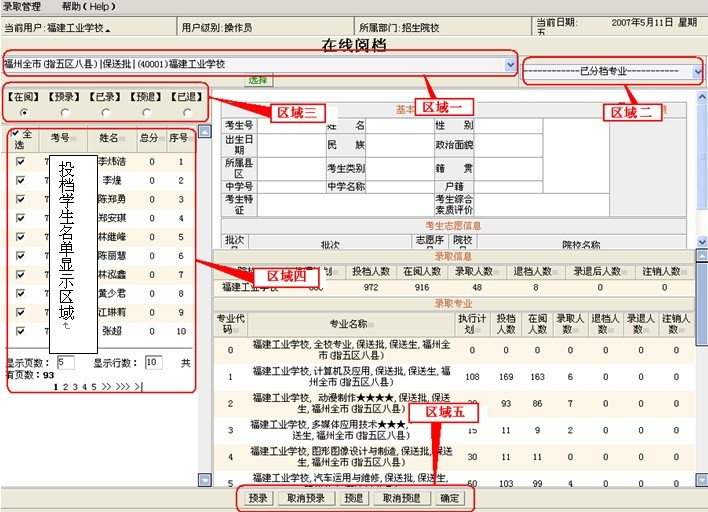在整个录取操作页面中,主要有下图所示的五个区域可以进行与录取有关的操作。