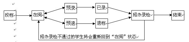 投档后,所有本批次投档本校的学生处于“在阅”状态,这时学生可从“在阅”状态进入“预录”或“拟退”状态,或从“预录”或“预退”状态回到“在阅”状态,“预录”或“预退”状态的学生可以进入“已录”或“退档”状态,但“已录”和“退档”状态不能再回到“预录”或“预退”状态。