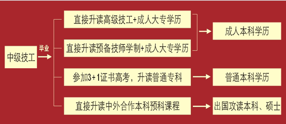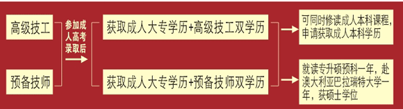 预备技师、高级技工教育实行与成人大专课程一体化的培养模式,学生在校期间,通过成人高考录取后,在获得预备技师或高级技工毕业证书,还可获得成人大专毕业证。还可同时申请修读成人本科课程,获得成人本科文凭