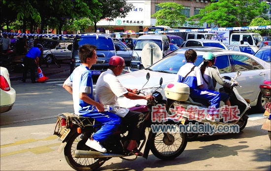佛山荣山中学,中考结束后,考生们坐上父母的摩托车回家。本报记者 郭继江 摄