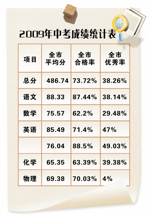 据基教科负责人介绍,4万多考生中将有2.1万被普通高中录取,初中毕业生升学率将达96.8%。全市总平均分为486.74分,比去年的469.24分提高17.5分。其中全市中考最高分为677分,共有两人,均来自东莞中学松山湖学校。