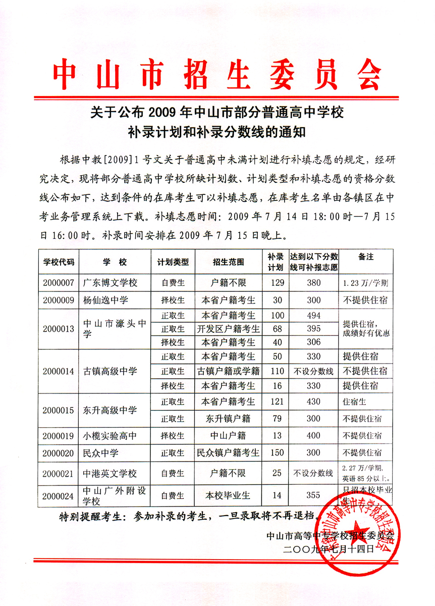 中山市2009年高中体艺特长生联招最低分数线与出档分数线