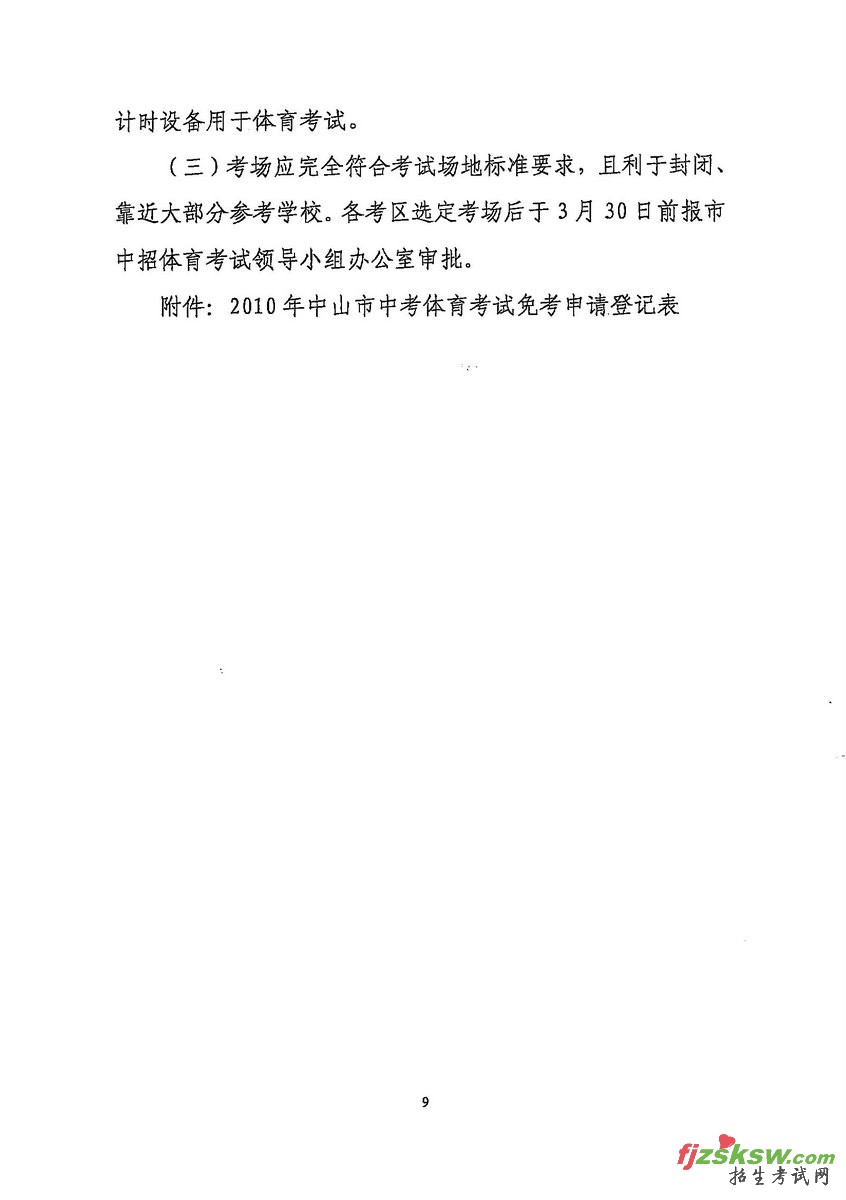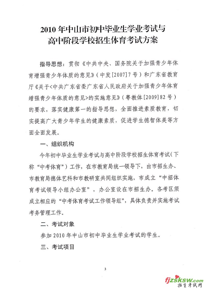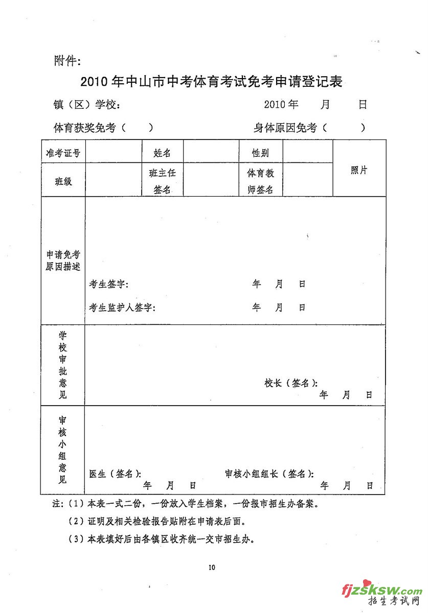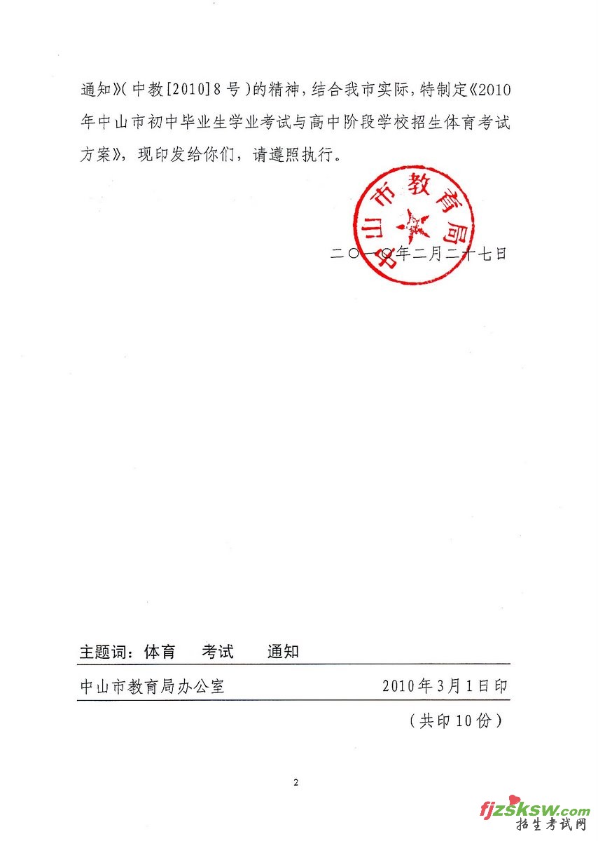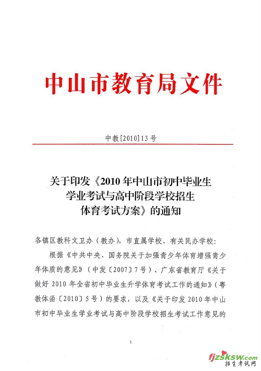 关于印发《2010年中山市初中毕业生学业考试与高中阶段学校招生体育考试方案》的通知