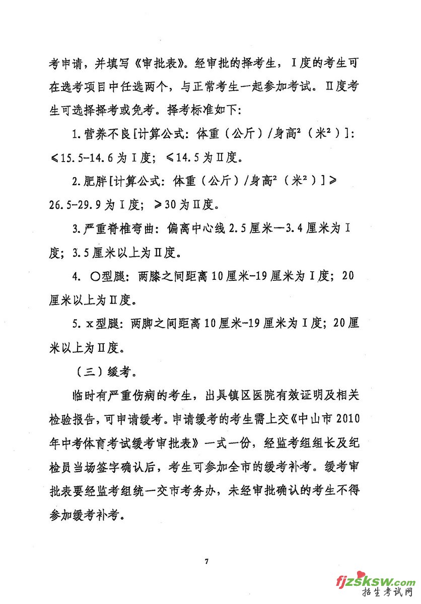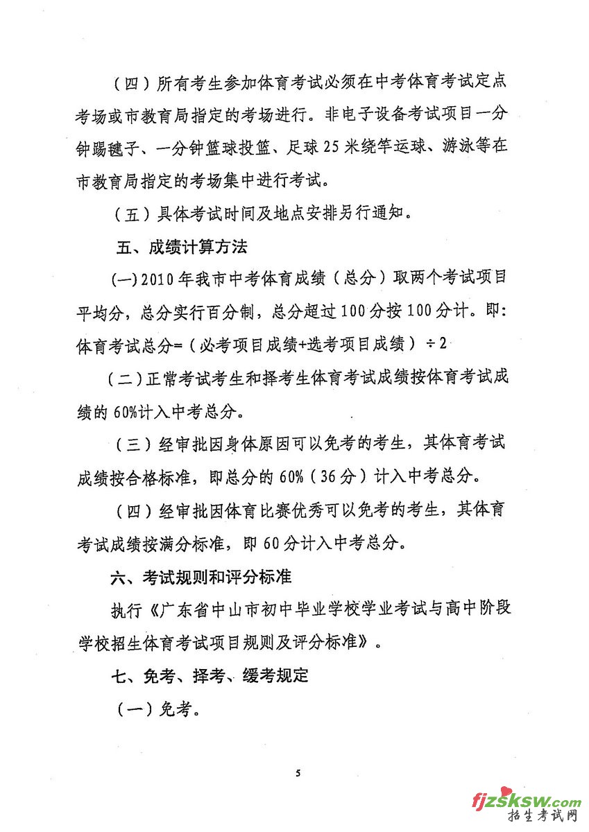 2010年中山市初中毕业生学业考试与高中阶段学校招生体育考试方案