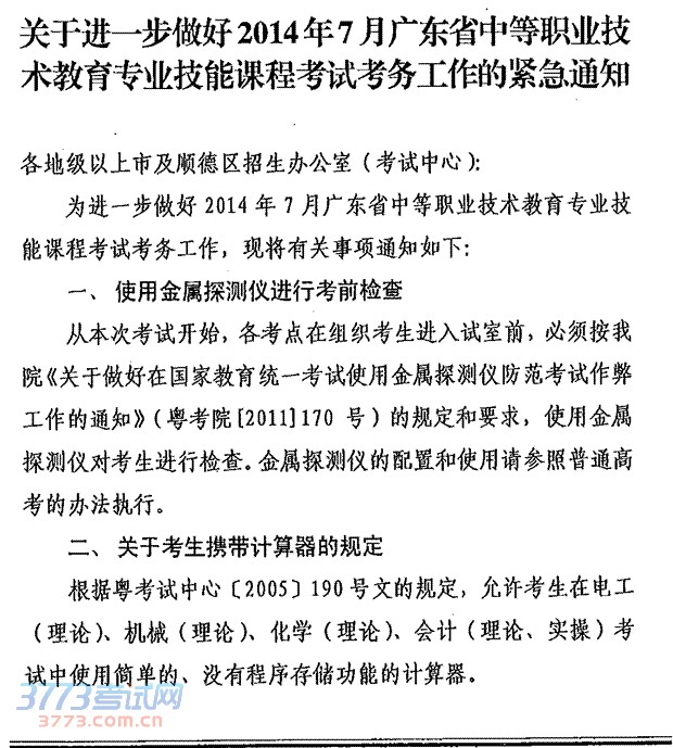 关于进一步做好2014年7月广东省中等职业技术教育专业技能课程考试考务工作的紧急通知