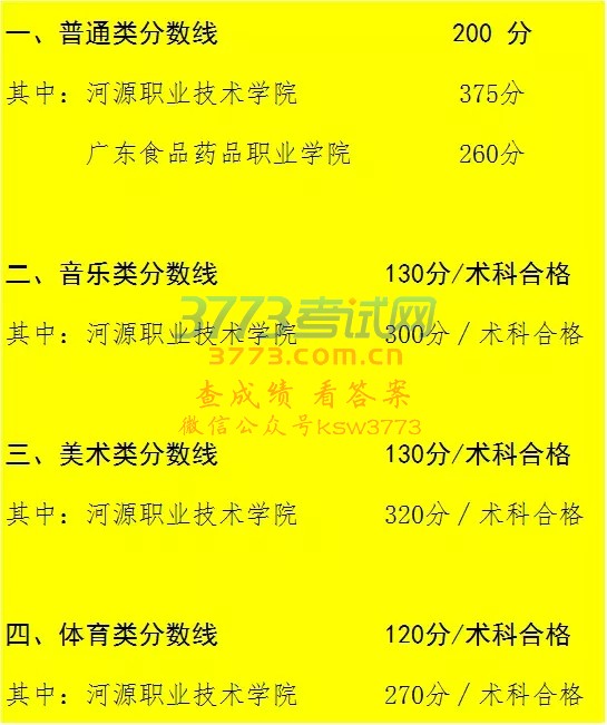 广东省招生委员会决定,广东省2018年高职院校五年一贯制单独招生考试全省统考录取最低分数线按普通类、音乐类、美术类和体育类专业分别划定,具体如下: