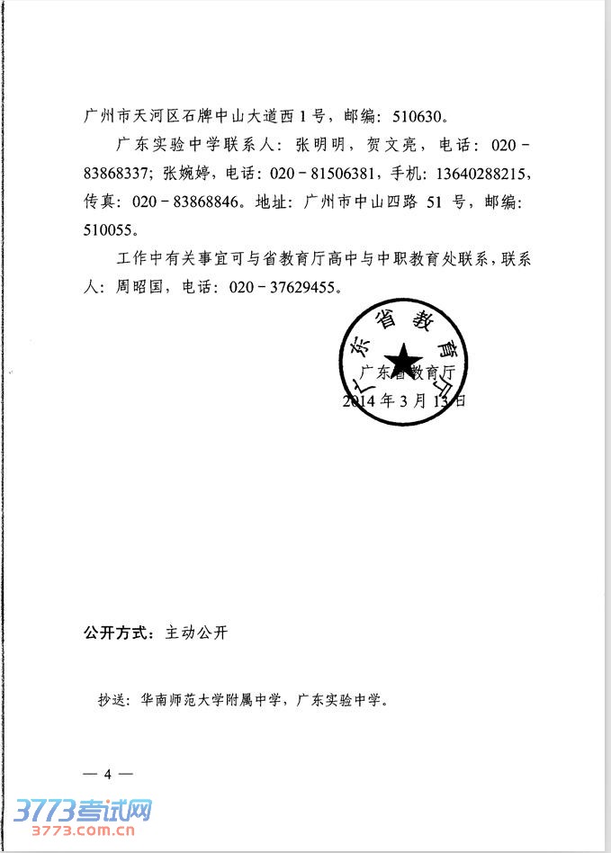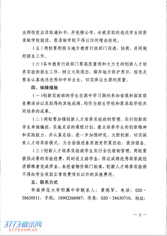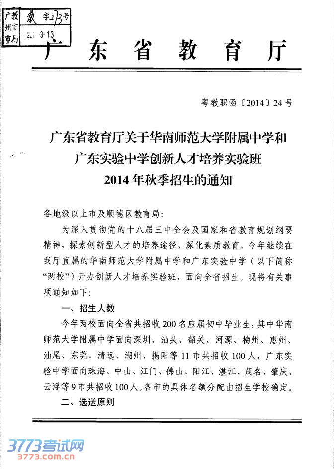 华南师范大学附属中学和广东实验中学创新人才培养实验班2014年秋季招生的通知