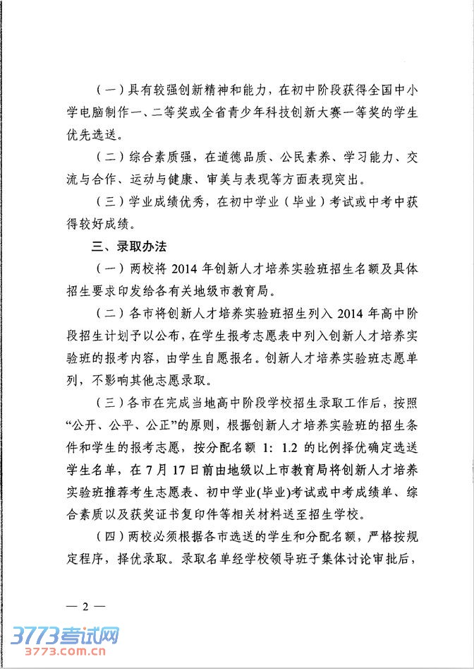 华南师范大学附中和广东实验中学创新人才培养实验班2014年招生