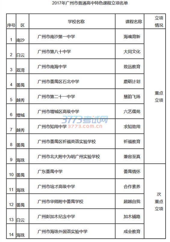 根据《广州市教育局关于开展2017年普通高中特色课程申报工作的预通知》(穗教基教一〔2016〕40号),经课程建设办初审、专家评审组评审以及领导小组审议,共有14所学校的14门课程通过2017年广州市普通高中特色课程立项,其中获得重点立项课程9门、次重点立项课程5门(详见附件)。