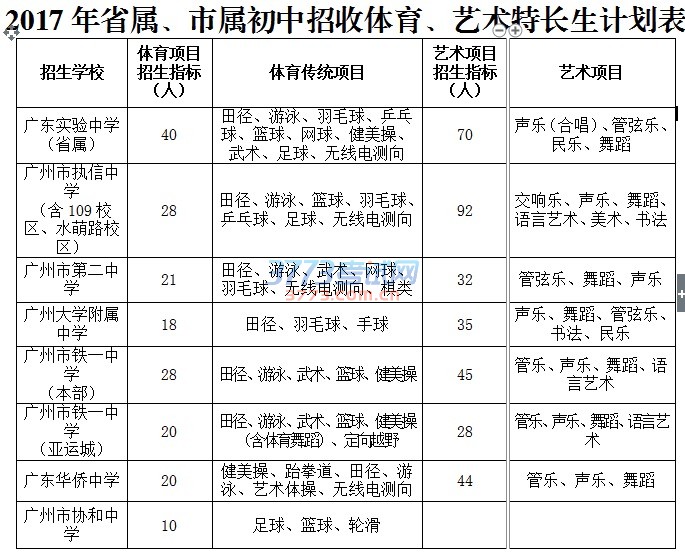 2017年省属、市属初中招收体育、艺术特长生计划表