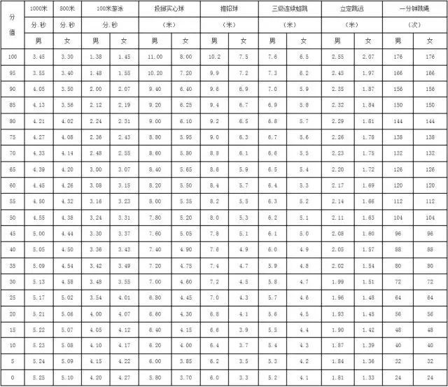 男生1000米满分为3.42s,女生800米满分为3.3s