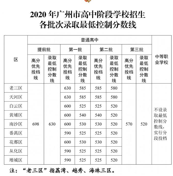 2020年广州市高中阶段学校招生各批次录取最低控制分数线公布!