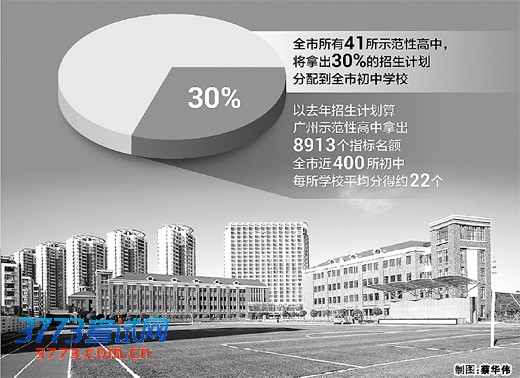 在广州的征求意见稿中,指标到校的路径大致如下:全市所有41所示范性高中,将拿出30%的招生计划,分配到全市初中学校(包括民办学校,不包括特殊学校)。以去年高中招生计划来算,全广州示范性高中将拿出8913个指标名额,分配到全市近400所初中,每所学校平均分得约22个。