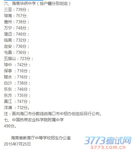 现将面向全省招生的普通高中学校第一批次的入围分数线公布如下(已含省定优惠政策加分): 中国热带农业科学院附属中学490分。