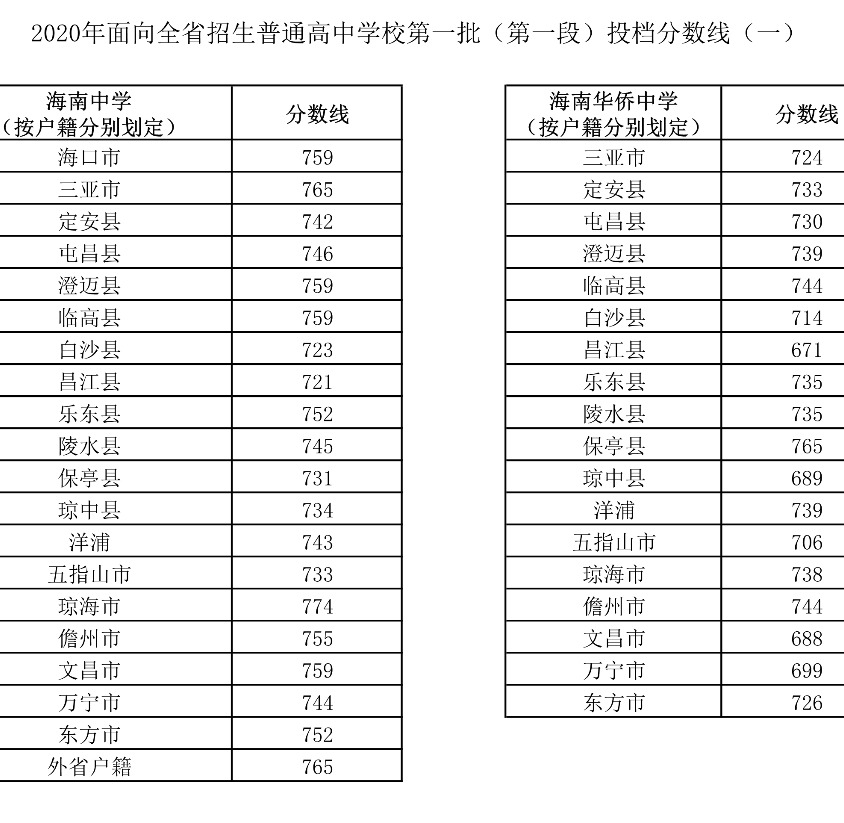 2020年面向全省招生普通高中学校第一批(第一段)投档分数线(一)