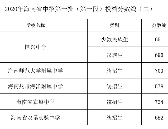 2020年海南省中招第一批(第一段)投档分数线(二)