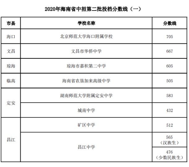 2020年海南省中招第二批投档分数线(一)