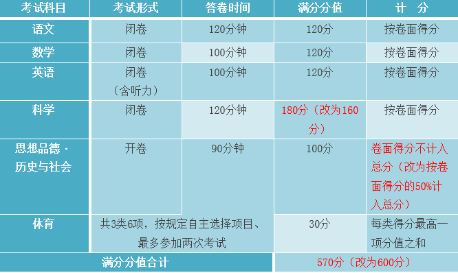 调整后的满分分值和计分方式具体为:①科学学科的满分分值由180分调整为160分;②思想品德·历史与社会学科的计分,由卷面得分不计入总分调整为按卷面得分的50%计入总分。按照上述调整,2017年市区初中毕业升学考试的满分分值将由现在的570分调整为600分(含体育中考)。