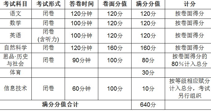 2.信息技术学科,满分共10分。按全市参加考试学生数百分比划分,分成8个等级为A、B、C、D、E、F、G、H,按等级相应赋分值计入总分。