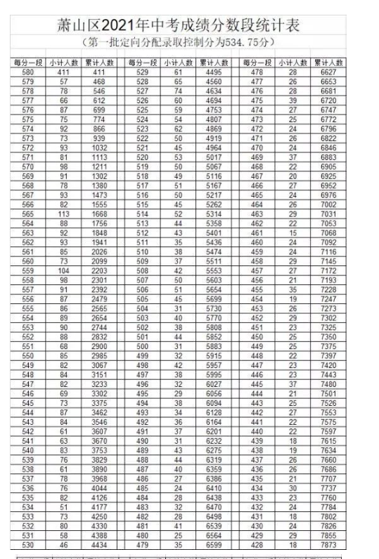 2021年浙江杭州萧山中考第一批定向分数线公布,希望对同学们有所帮助,仅供参考。 根据今年的分数段统计表显示,2021年萧山中考第一批定向分配录取控制分为534.75分;其中,580分及以上的考生有411人,535分及以上的考生有4126人。