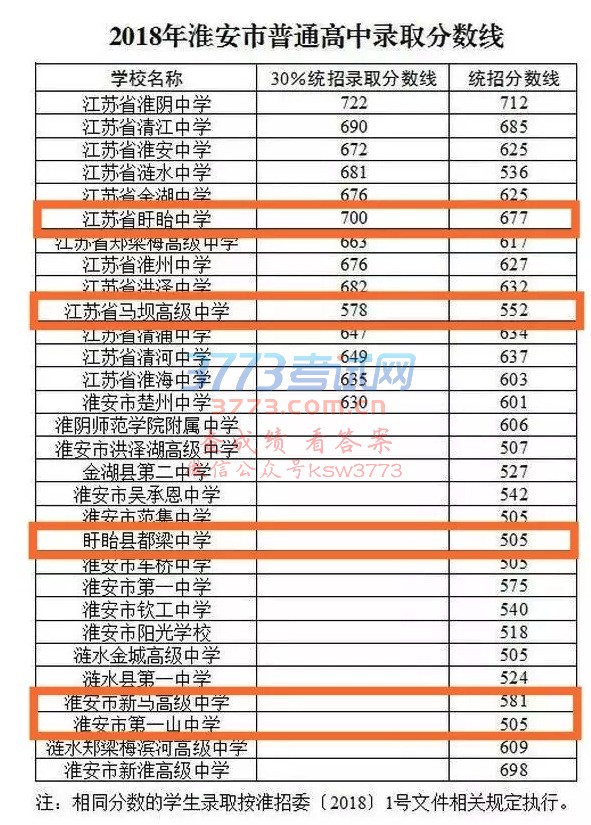 今天,淮安市教育局官方网站公布了2018年淮安市普通高中录取分数线,具体如下: