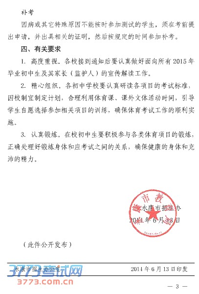 永康市招生办2015年初中毕业体育考试工作实施意见