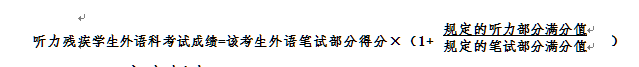 7.凡持有残疾证的听力残疾学生,经本人申请,县教育局认定,可以免外语听力测试。听力残疾学生免外语听力测试考生的外语成绩按以下公式计算: