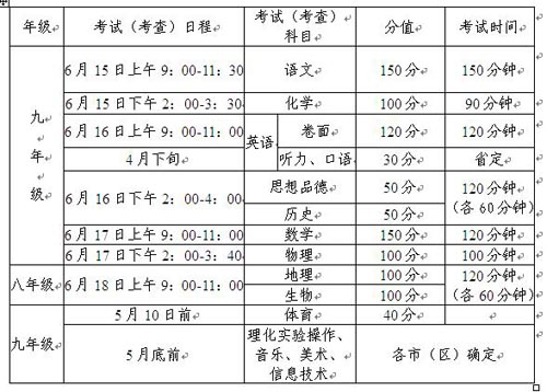 我市明年中考时间将作一定调整。由原来16日至18日调整为15日至17日,18日则进行八年级的地理和生物两门课程的考试。同时,每门考试开始时间也作了调整,上午由8:30推迟到9:00,下午由2:30提前到2:00。