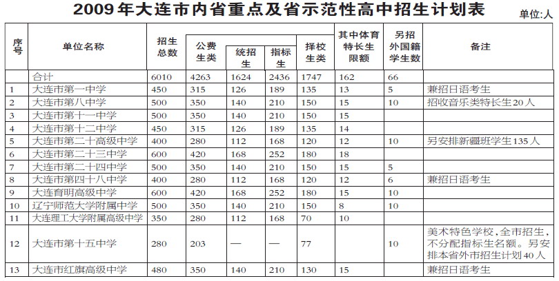 2009年大连市内重点高中、省示范性高中招收指标到校生分