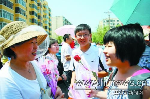 25日,哈市69中学4年13班班主任带着鲜花来到考场,为参加中考的学生加油。记者李巍摄