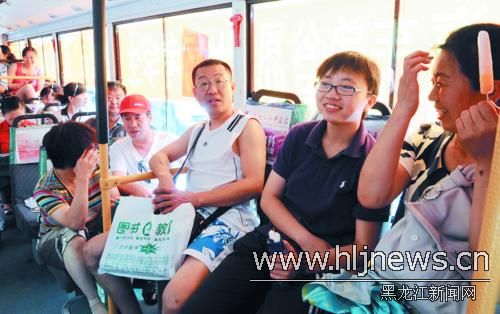 25日,哈市公共汽车总公司14路车队派出空调大巴守候在多个中考考点,为考生家长提供避暑的场所。记者荆天旭摄