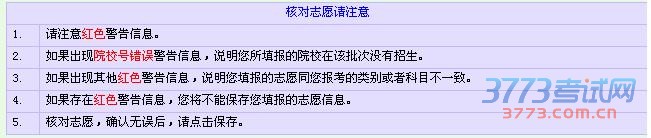 如果在上面的志愿信息栏里有红色的警告信息,则说明你所填报的志愿不符合专业目录的要求,此时,须点击“修改”返回修改的页面,修改不符合专业目录要求的志愿信息(红色信息警告的位置)后才能保存这个批次的志愿。