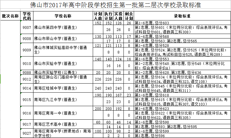 9015 南海区九江中学(普通生) 190 190 167 23 第1-6志愿,总分618