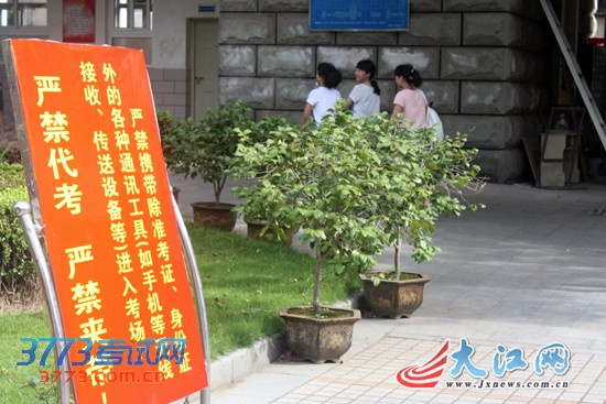 考点内摆放的“严禁代考、严禁夹带”的警示牌。