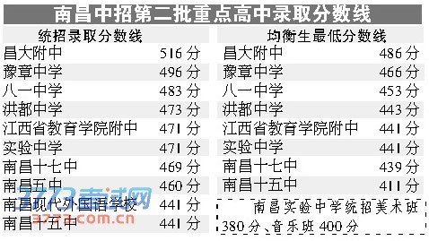 本报讯 记者方维芳 实习生万菁报道:昨日,记者从南昌市教育考试院获悉,南昌市2013年中招第二批重点高中统招最低录取分数线正式公布,最低录取分数线划定为441分。第二批重点高中分数线最高的为南昌大学附中516分。