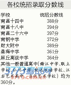 记者注意到,第四批次一般普通高中统招最低录取分数线划定为360分。而统招分数线最高的是南昌二十六中的397分。