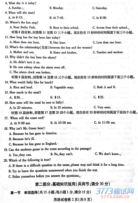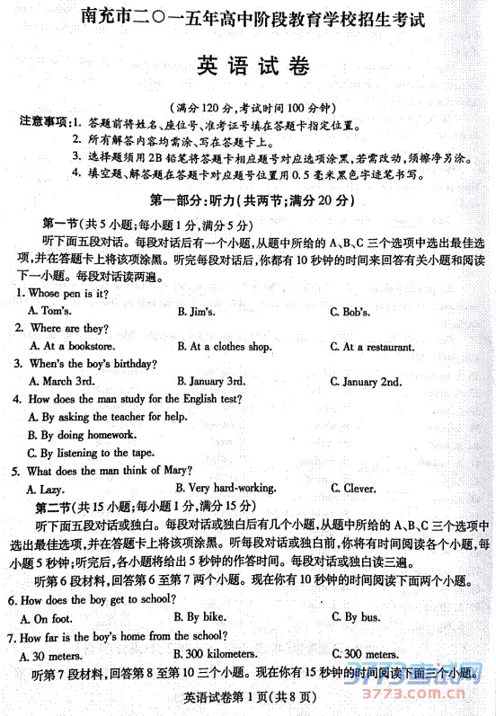 公布南充中考试题、答案和中考作文。祝各位考生都能取得好的成绩。2015四川南充市中考英语试题(图片版):