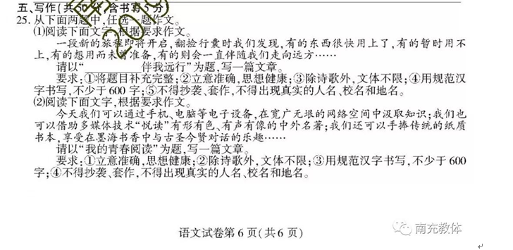 2019四川南充中考作文题目:___伴我远行/我的青春阅读