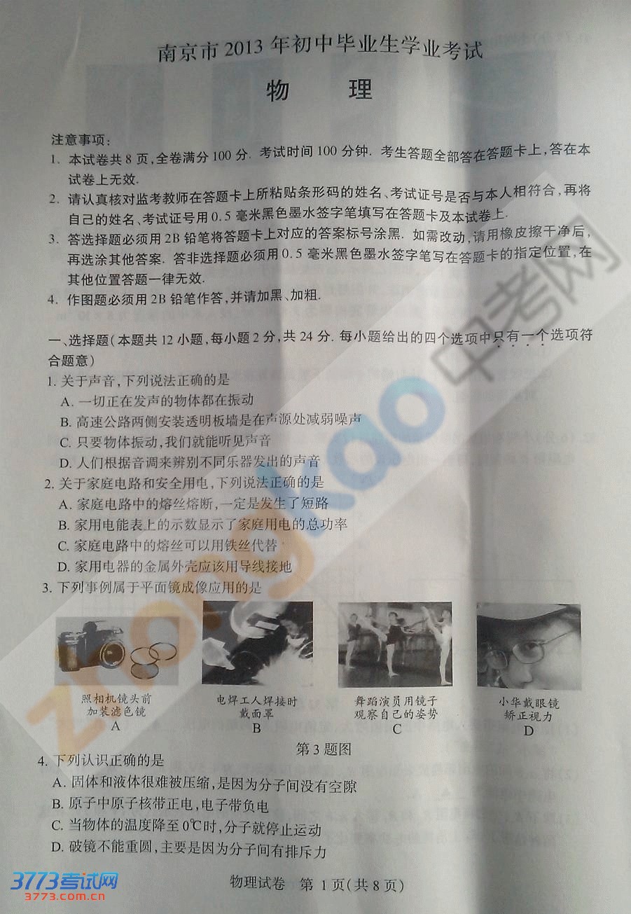 2013南京中考物理试卷试题