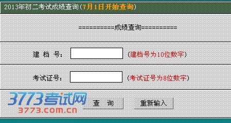 2013年南京初二考试成绩查询(7月1日开始查询) ==========成绩查询========== 你的建档号或考试证号有误,请重新输入! 建 档 号: (建档号为10位数字) 考试证号: (考试证号为8位数字)