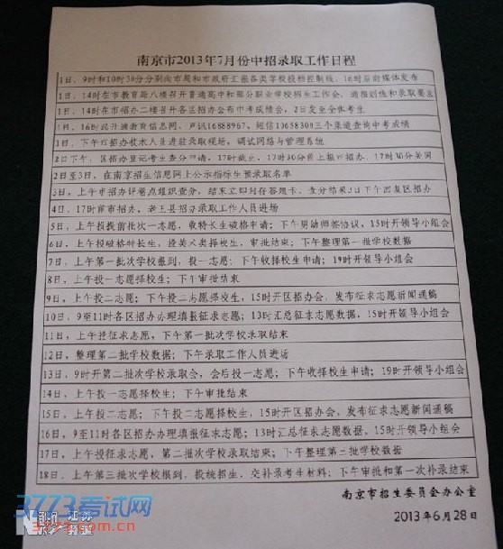 2013年南京中考录取工作日程情况
