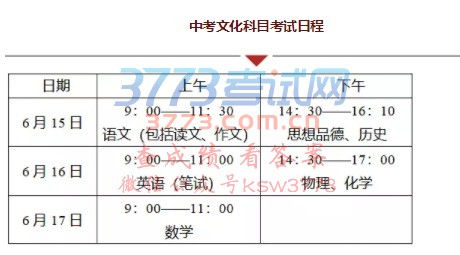 文化科目考试日期定于6月15日、16日、17日三天。考试用时:语文150分钟,数学120分钟,英语120分钟,物理与化学150分钟,思想品德与历史100分钟。具体安排如下: