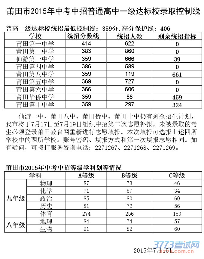 莆田市2015年中考中招普通高中一级达标校录取控制线