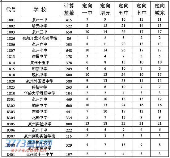 泉州一中、培元中学、泉州五中、泉州七中、泉州城东中学在高中招收统招生计划数中,按50%比例划出部分统招生名额作为定向生,直接分配到鲤城区、丰泽区、洛江区、台商投资区的所有初中校(含完全中学初中部),招收具有该校两年以上学籍且在该校就读两年以上的学生。