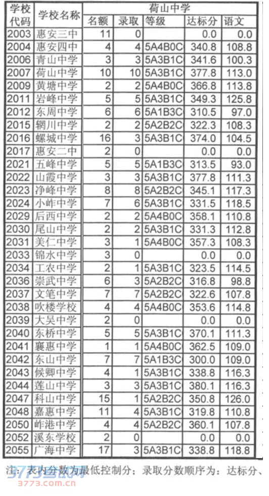 2014惠安荷山中学定向招生切线分数线