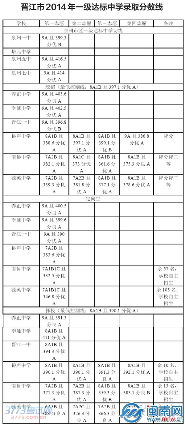 晋江市2014年一级达标中学录取分数线