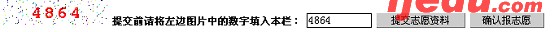 须先将左边图片中的红色数字填入文本框内,此数字每次刷新页面都会变化,然后按“提交志愿资料”按钮,在弹出的对话框上点击“确定”按钮,如果提交成功则会跳转到志愿查看页面,如果提交不成功会返回志愿填报页面。最右边的“确认报志愿”按钮的作用是,一旦确认,则考生自己将不能再修改自己的志愿。最后由学校在规定的时限内打印,考生本人及家长签名后提交给学校。