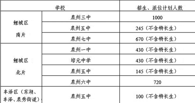 泉州三中、泉州五中、泉州七中3所中学,招收泉州市实验小学、泉州师院附属小学、泉州市晋光小学、鲤城区第二中心小学、通政中心小学、立成小学、鲤城区实验小学、鲤城区东门实验小学、新隅小学、泉州市第三实验小学10所小学的毕业生。