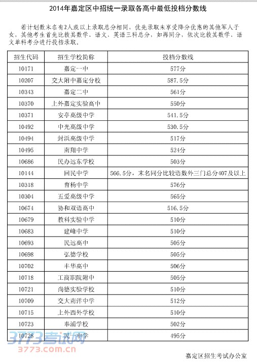 2014上海市崇明县中考零志愿100%投档最低分数线