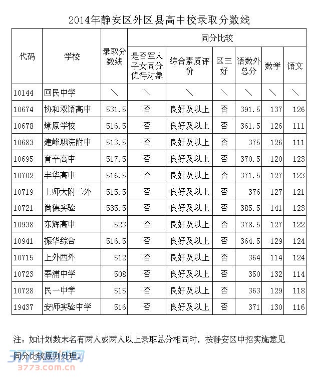 2014上海静安区外区县高中校录取分数线